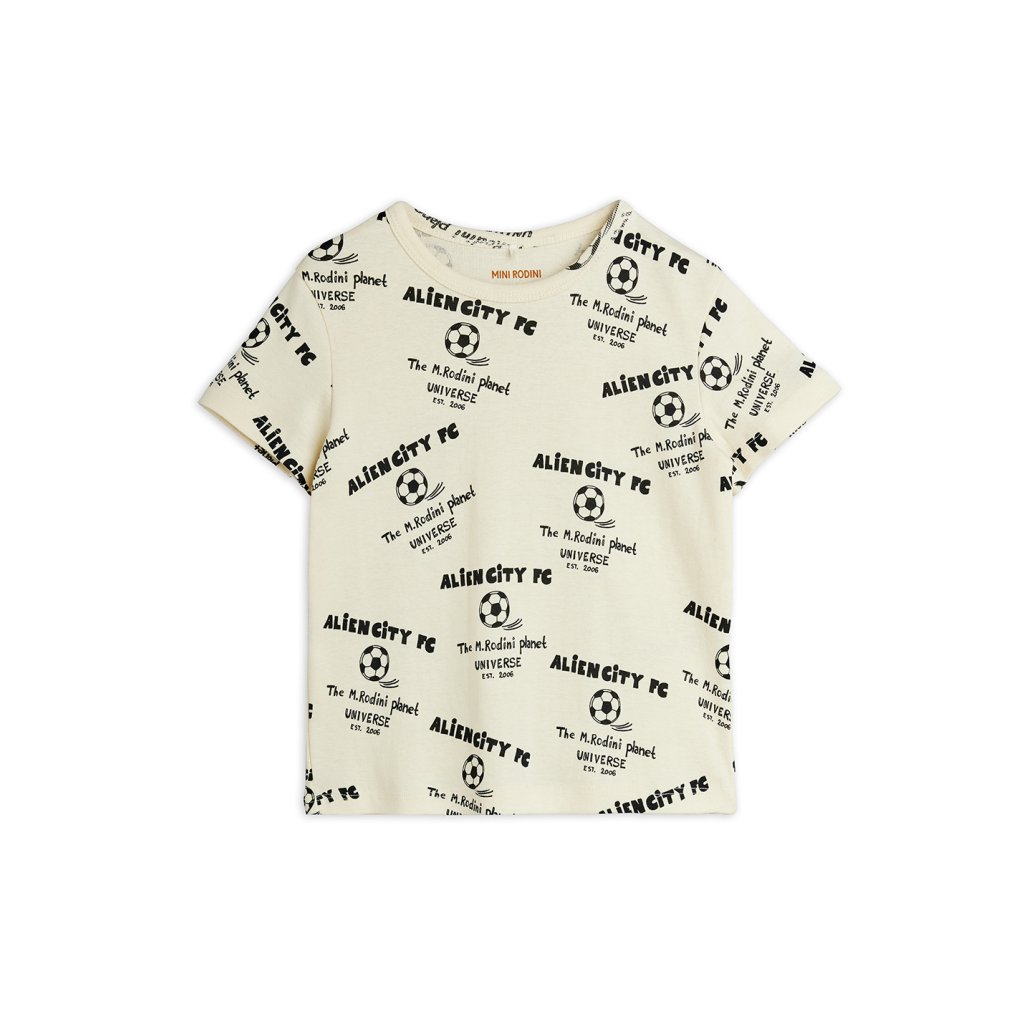 Stylové dětské tričko Mini Rodini ze 100% organické bavlny s celoplošným potiskem Alien City FC. Měkké, pohodlné a GOTS certifikované – ideální pro každodenní nošení.