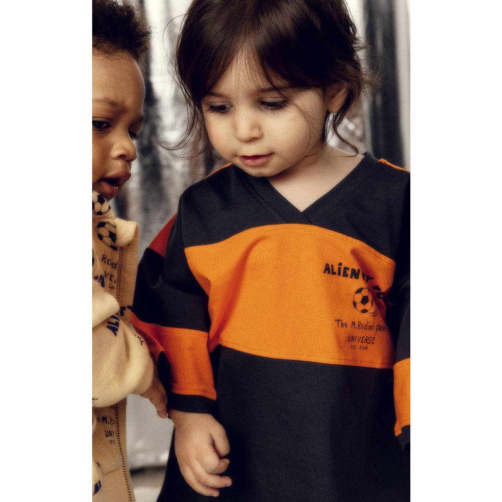 Stylové dětské tričko Mini Rodini s volným střihem a výraznými kontrastními pruhy zaujme na první pohled. Sportovní design doplňuje potisk Alien City FC s fotbalovým motivem na hrudi, který vychází z ikonického světa značky.