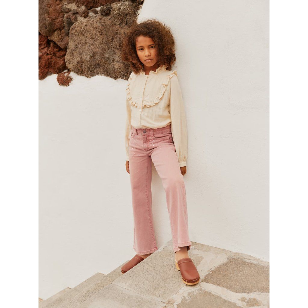 Dětské růžové džíny s kamínky a rozšířenými nohavicemi
