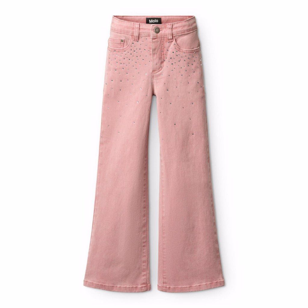 Dětské růžové džíny s kamínky a rozšířenými nohavicemi. Pohodlný elastický materiál, nastavitelný pas a stylový design pro děti.