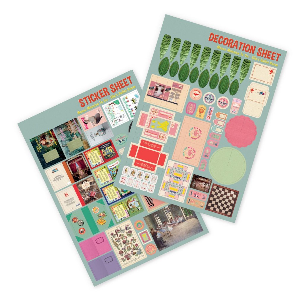 Teď je čas na zdobení! Pomocí vyražených listů si můžete složit vlastní miniaturní krabice na boty, stínidla, rostliny a dokonce i malou karetní hru. List samolepek je plný zábavných drobností, jako jsou obaly na knihy, baletní plakáty a další veselé detaily, které doplní baletní místnost.