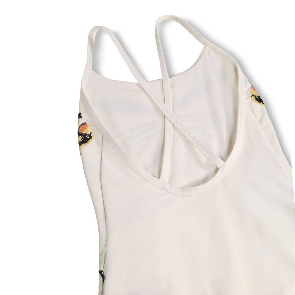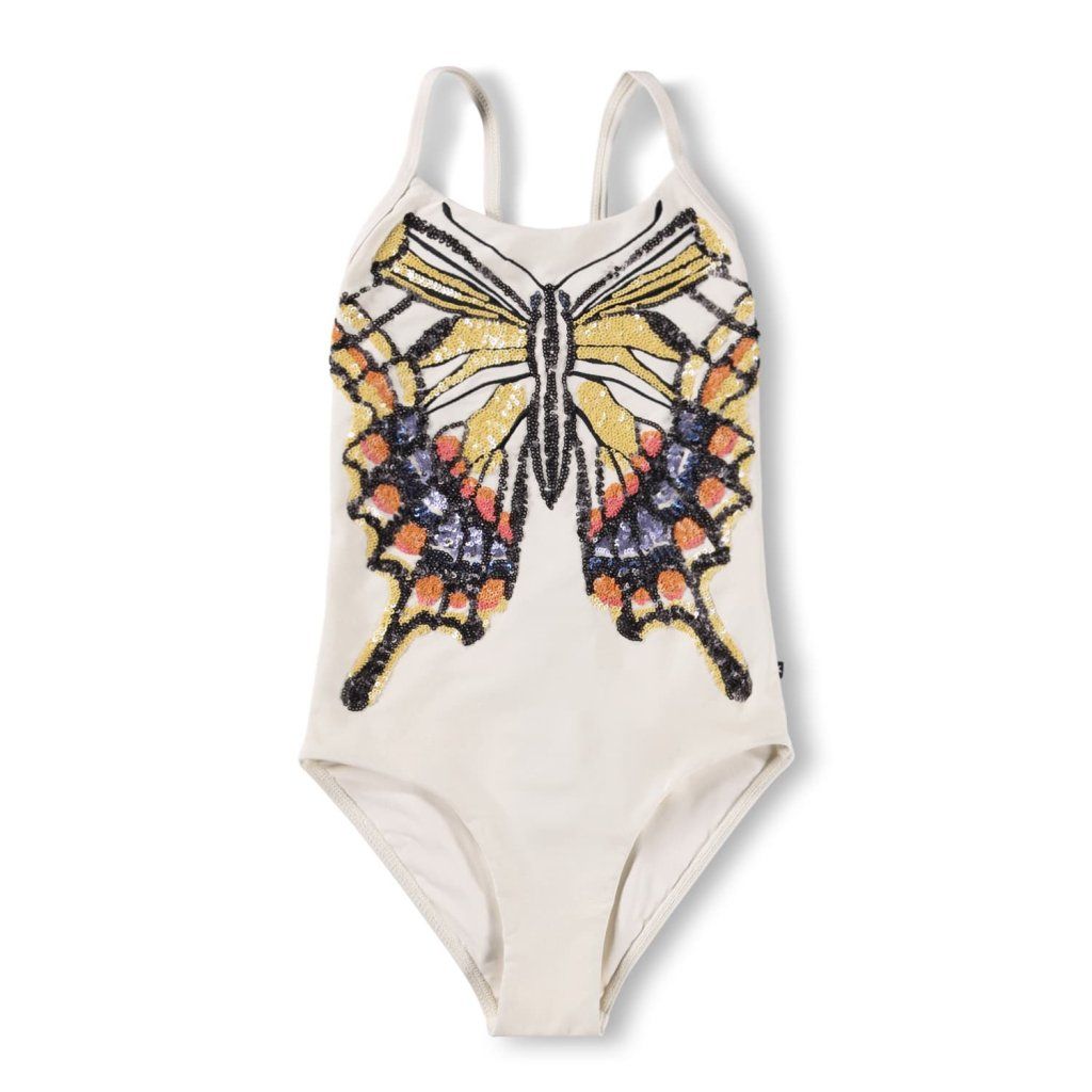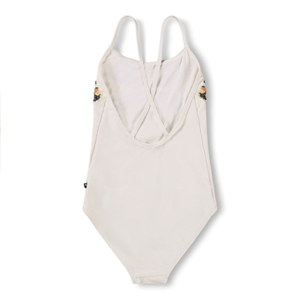 Dětské bílé plavky Molo s flitrovým motivem a UV ochranou 50+. Vyrobeno z recyklovaného polyesteru, pohodlný střih a nastavitelné ramínka.