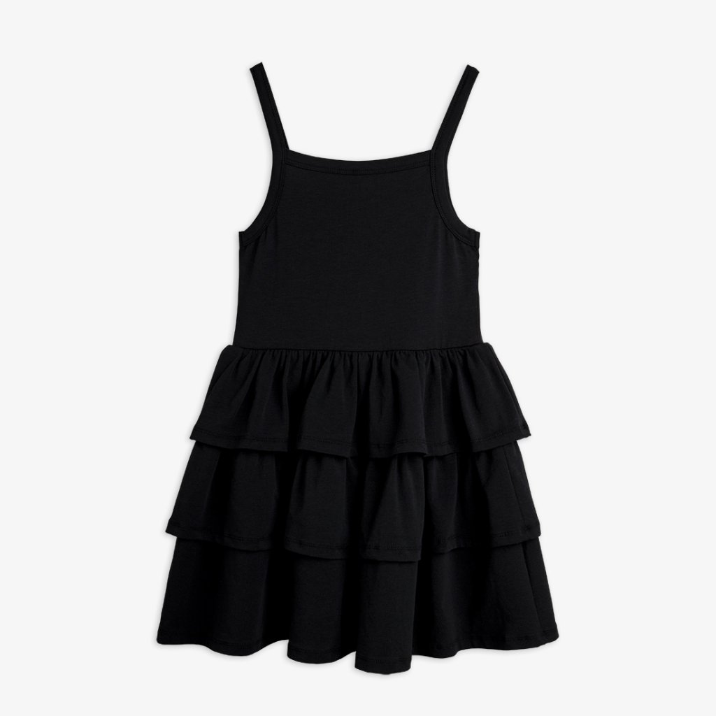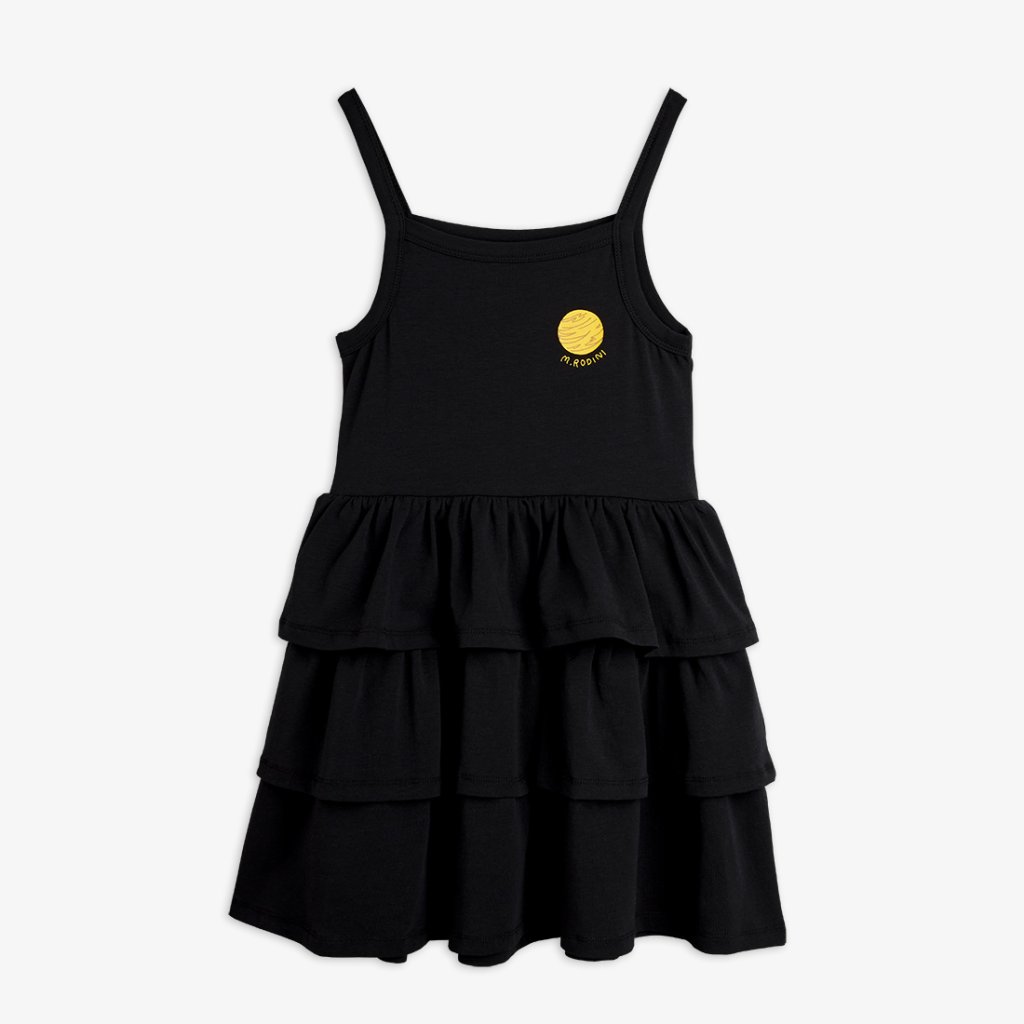 Lehké dívčí šaty Mini Rodini z organické bavlny s příměsí elastanu. Tenká ramínka, nabíraná volánová sukně a jemný Planet motiv na hrudi – ideální na léto.