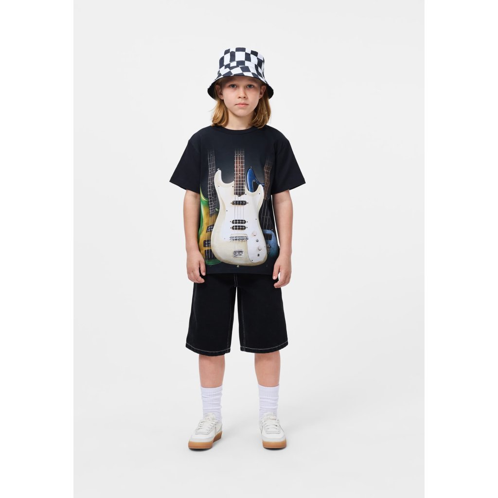 Dětské černé tričko Molo s barevným potiskem rockových kytar z jemné organické bavlny. Pohodlný střih, kvalitní materiál a certifikace GOTS. Stylové tričko pro děti.