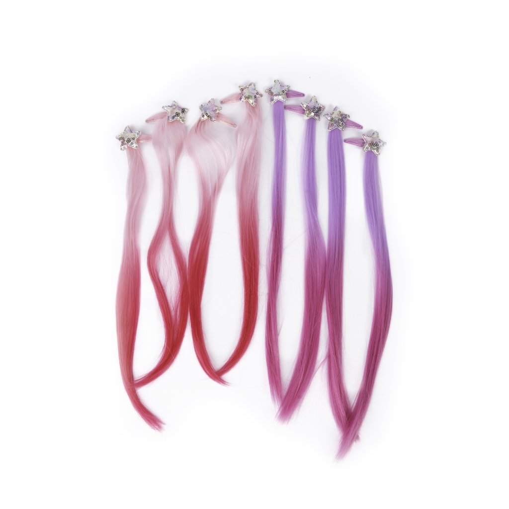 Sada je krásně zabalená v dárkové krabičce a obsahuje 8 pramínků – 4 růžové ombré (od světle růžové po sytě růžovou) a 4 fialové ombré (od tmavě fialové po růžovou). Každý pramínek je zakončen třpytivou sponkou s hvězdičkou, která dodává účesu extra lesk a glamour.