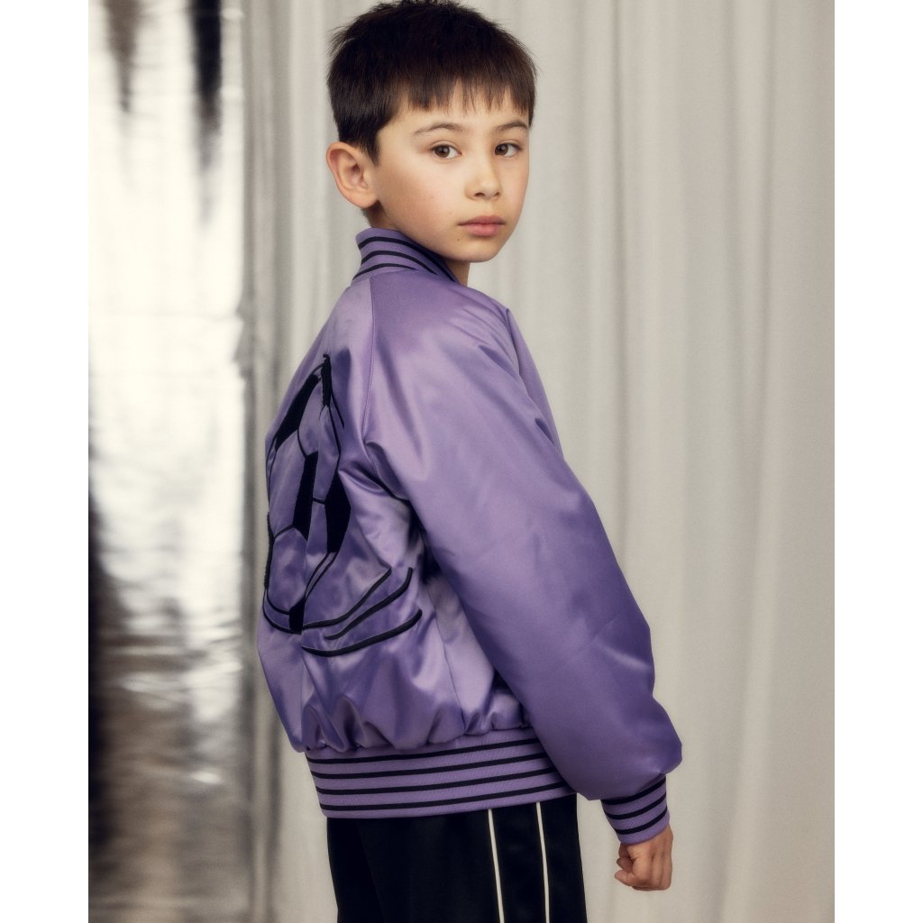 Stylová dětská baseballová bunda Mini Rodini s výraznou fotbalovou nášivkou na zádech. Vyrobena ze 100% recyklovaného polyesteru – udržitelná, pohodlná a ideální na jaro i podzim.