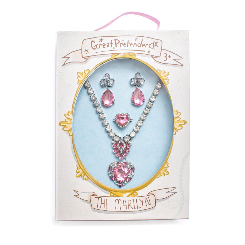 Elegantní sada The Marilyn kombinuje odvážné růžové kamínky s jemnými perličkami. Sada obsahuje klipsové náušnice, prsten ve tvaru srdce a koordinovaný náhrdelník s perlovými a třpytivými přívěsky – ideální dárek pro malé princezny.