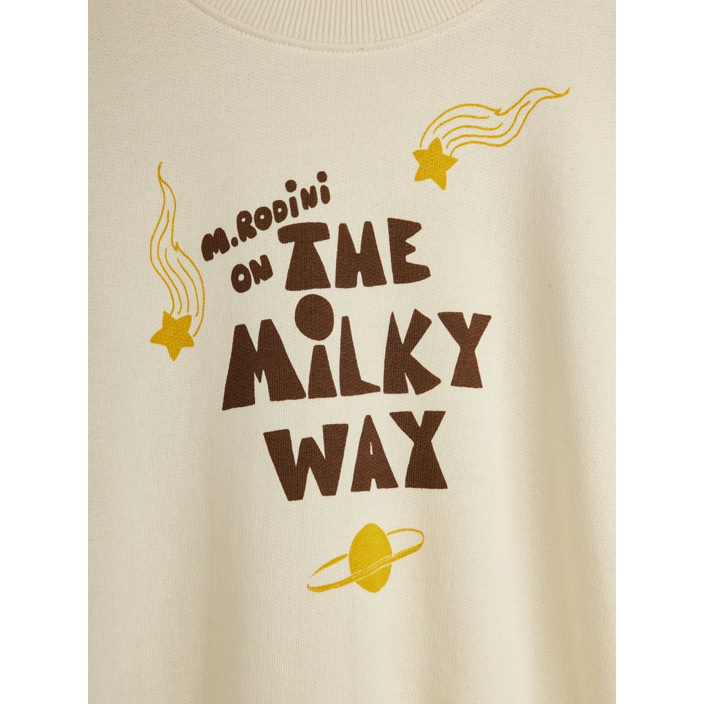 Pohodlná dětská mikina Mini Rodini ze 100% organické bavlny s potiskem The Milky Way s motivem hvězd, komet a planety. Volnější střih a měkký vnitřek pro maximální komfort.