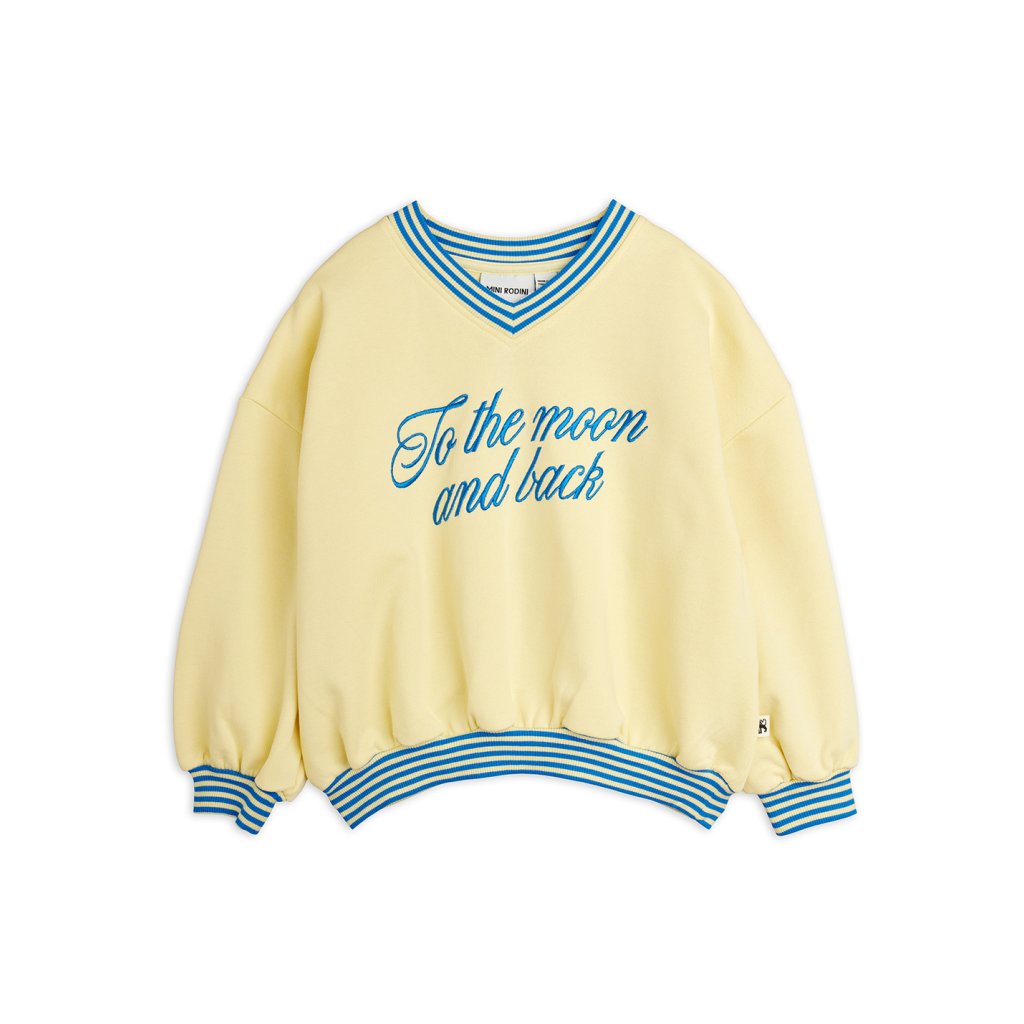Stylová dětská mikina Mini Rodini ze 100% organické bavlny s výšivkou „To the Moon and Back“. Pohodlný relaxed střih, kontrastní žebrované lemy a udržitelná výroba s GOTS certifikací.